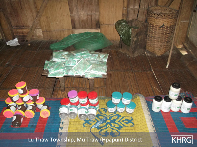 These photos were taken in October 2012 by a community member trained by KHRG. They show Lu Thaw Hpaw Day thay ghee wa seh, which is a traditional medicine group which makes 10 types of medicines in Ta Yuh Per Hkoh T’ Bee Hta place. This group has 24 men and women as general members, and has 9 committee members. They make their medicine in Hkay Poo village tract, and need leaders and teachers to provide suggestions and guidance for them to assist with making their work run smoothly to benefit local people. One committee member told the community member trained by KHRG, that the organization specifically needs more colouring agents to give medicine capsules their colour, which helps with identification, and also containers that can fit 100 tablets, in order to distributethe medicine. [Photos: KHRG]