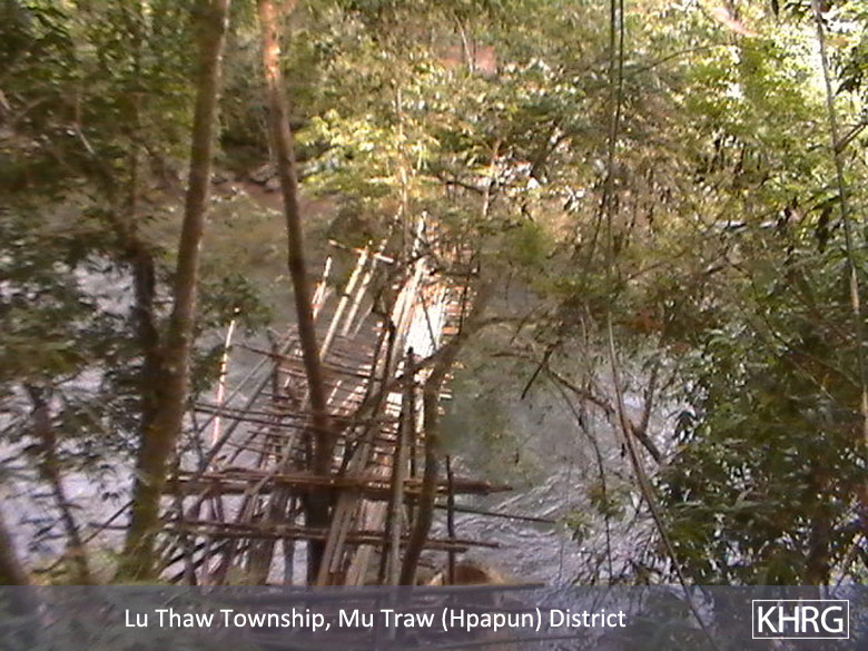 The photo on the left was taken by a community member trained by KHRG on September 6th 2012, and shows a bridge constructed by Tatmadaw soldiers across the K’ Hploh Loh river in the Ta Hkeh Der area, Hkay Poo village tract. The photo on the right is of the K’ Hploh Hta Bridge, which is located on the Pgoh Loh River. Both bridges were built by theTatmadaw andused for travelling and transporting rations, but civilians are able to use both levels of the two-story bridges. [Photos:KHRG]