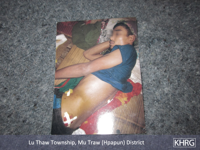 These two photos were taken on November 10th2012 by a community member trained by KHRG.The photo on the left shows a photo of Saw H---, a villager from Y--- village who was 19 years old when the Tatmadaw Light Infantry Division (LID) #66 shot and killed him on March 9th 2012, in the K’ Kyay Hta area. After killing him, the soldiers took the 160,000 kyat he carried and, as can be seen in the photo, removed one of his legs. The photo on the right shows a photo of Saw N---, a villager fromY--- village who was28 when LID #66 shot him in his hip and his waist on March 9th 2012 as he travelled with Saw H--- in K’ Kyay Hta. The local home guard found Saw H--- at the site of the shooting on March 16th 2012.[Photos: KHRG]