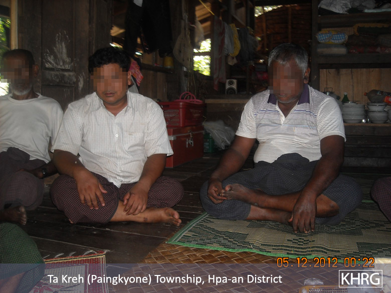 The above photos were taken on December 5th2012 by a community member trained by KHRG. The photo on the left shows the village road and Muslim mosquein T--- village, Ta Kreh Township, Hpa-an District. The photo on the right shows three Muslim villagers who attend this mosque, some of whom were interviewed by the community member, during which they explained that they feel helpless, as the events happening in Rakhine State and Mandalay Division also affect T--- villagers. They explained that they are afraid to buy things from Karen people and that Karen people now cannot sell things to the Muslim community. These villagers also informed the community member that they had lived among the Karen people their entire lives, during which no major problems occurred, however, they are now afraid that problems similar to those,which occurred between Christians and Buddhists in the past, will occur between Muslim and Buddhist villagers; finally, they believe that Burmese people are instigating these problems. [Photos: KHRG]