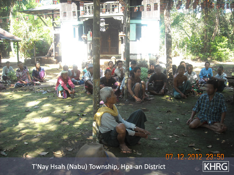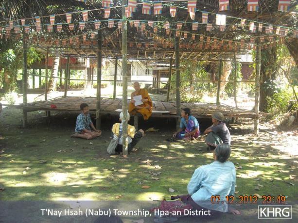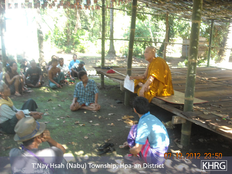The above photos were taken on December 7th 2012 by a community member, and show a monk and villagers sitting on the grounds ofthe M--- village monastery in Noh Kay village tract, T’Nay Hsah Township, Hpa-an District. According to the community member who took these photos, the M--- Monastery monks called villagers from P---, A---, W--- and M--- villages to attend this December 7th meeting. During the meeting, attended by 41 villagers, the monk read a letter outlining the forms of unacceptable conduct for Buddhist villagers in their relations with Muslim villagers; villagers were informed by the monk they had to follow the instructions in the letter and were told that if they did not follow the four points, they would be fined and charged; finally, the monk asked the villagers if they understood or not. [Photos:KHRG]