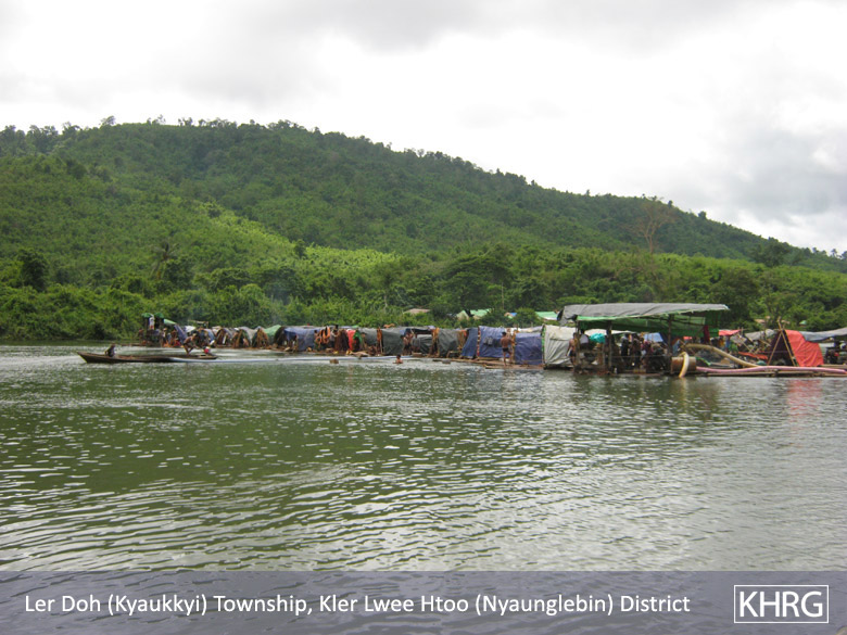 miners working below Shwegyin Dam. According to the community member who took these photos, each gold sluice has to pay 800,000 kyat (US $850.62) per month to Tatmadaw IB #57 as tax. [Photos: KHRG]