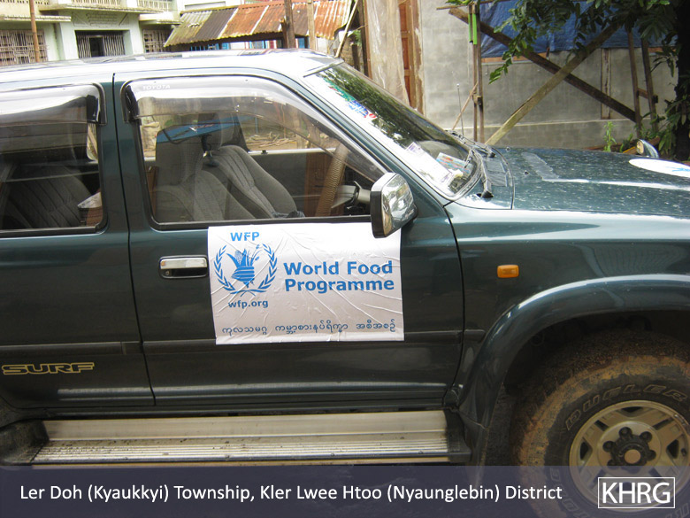 On July 29th 2012, flooding started [and] numerous villagers encountered many problems. They [villagers] had no boats [to travel] and villagers were put at risk of becoming jobless during the flooding, and they had to face the risk of their paddies dying as a consequence of one month of flooding. But, on August 22nd 2012, UNHCR [United Nations High Commissioner for Refugees] [World Food Programme (WFP)][9] staff came and helped villagers in the area of Kyauk Kyi Township. As government staff made the report [regarding how the flooding impacted villagers], [WFP] staff provided support [material aid] to villagers, (and the support was given to village leaders who distributed it to village households).