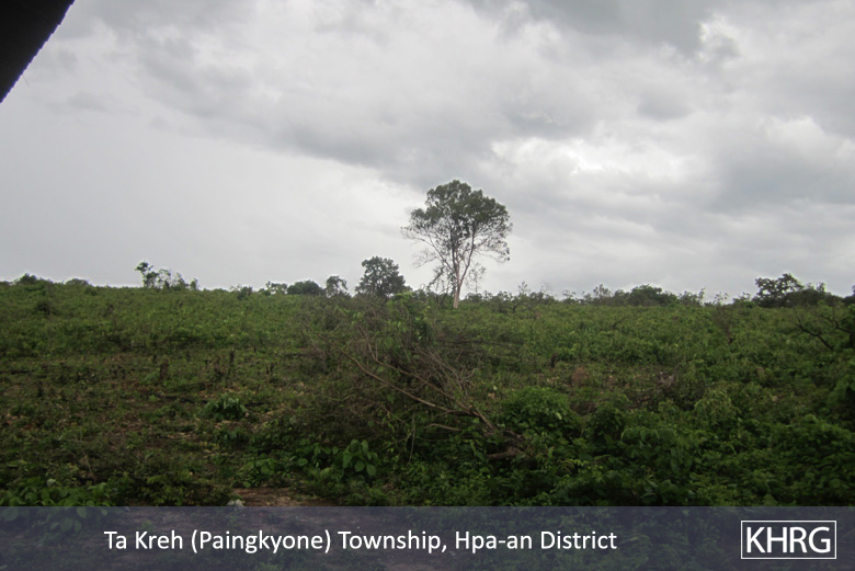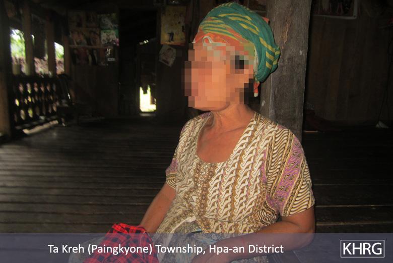 These two photos were taken by a community member train by KHRG on June 4th 2013 in H--- village, Taw Soh village tract, Ta Kreh Township, Hpa-an District. The photo on left shows 51-year-old Naw M---, who lives in H--- village. The photo on right shows her land that was confiscated by BGF’s Battalion Commander Boh Kya Aye. The photo on the left shows 51-year-old Naw M---, who lives in H--- village. The photo on the right shows part of the six acres of Naw M---‘s land that was confiscated by a veteran BGF Battalion Commander, Boh Kya Aye. According to the KHRG community member who spoke with Naw M---, Boh Kya Aye demanded Naw M--- pay 600,000 kyat to continue using her own land. In order to pay the bribe, Naw M--- sold her gold and five cattle and, after paying the money, the former commander informed her that, “We won’t disturb your land anymore,” however, she was not provided with any documentation to confirm this. [Photos: KHRG]