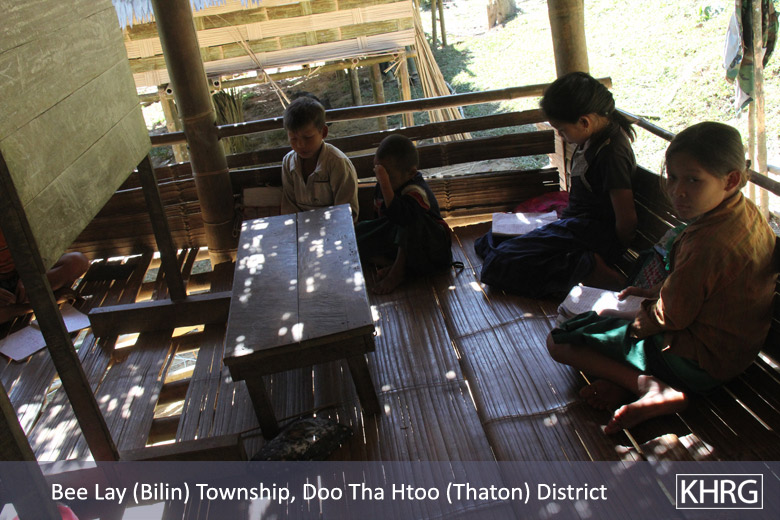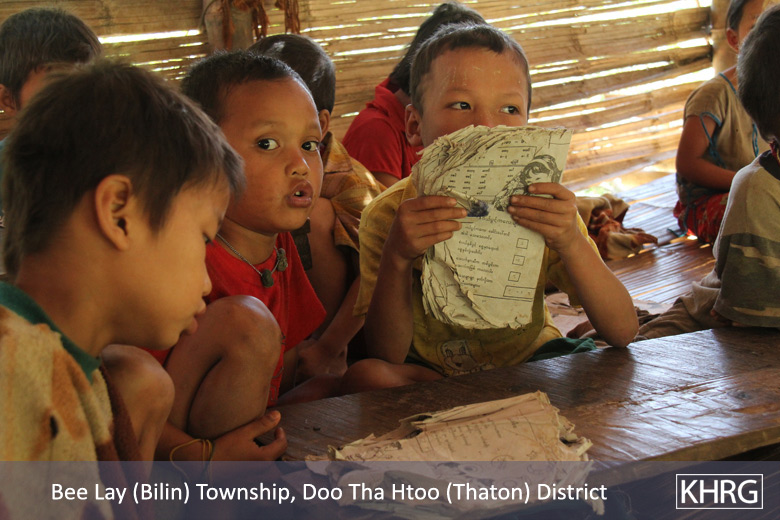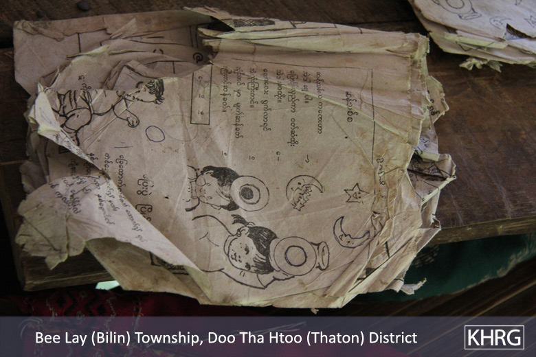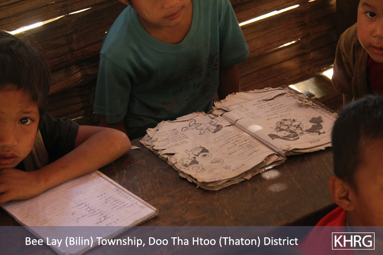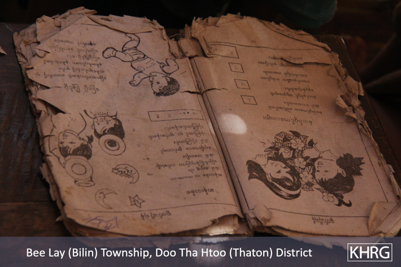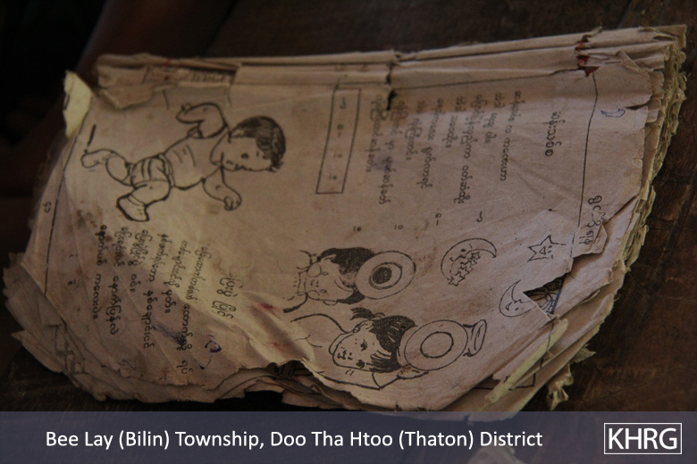 The above photos were taken on January 23rd 2013 by a community member in T--- village, Billin Township, Thaton District. In the photos above, children can be seen reading from what appear to be grade one reading materials, which are old and in very poor condition. The school is supported by Tharamu P---. T--- School is located in the rural portion of Billin Township of Thaton District. Because the village is outside of the area of Burma government control, the Government does not provide support to this school. The school has more than twenty students and it teaches up to grade three. The school was founded by T--- villagers and there is one female teacher. It relies on villagers for financial and other material support and curriculum support, as well as on some donors from outside the village. According to T--- villagers, the villagers had to flee during DKBA separation. Villagers were only able to return in 2010; at that time they founded the school. [Photos: KHRG]