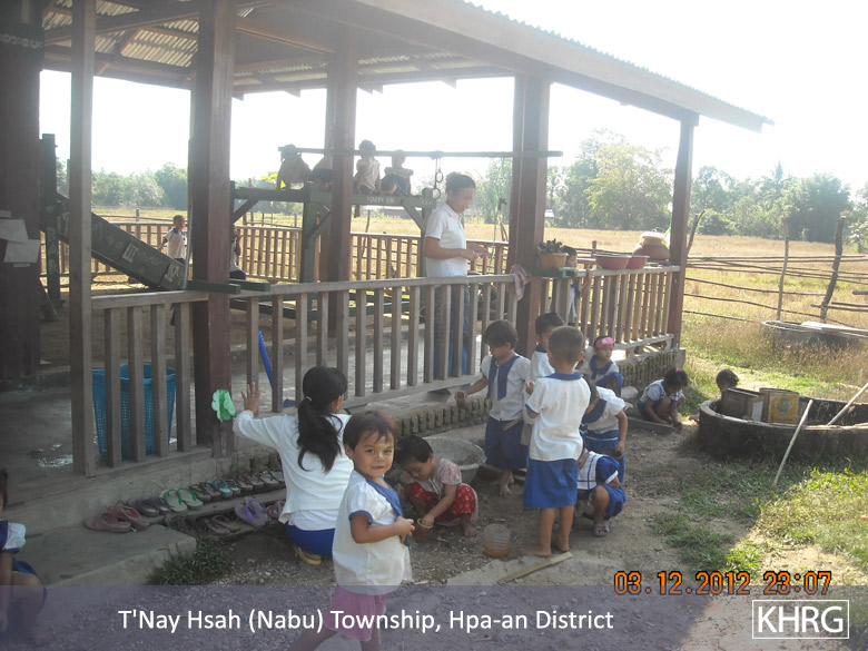 The above photos were taken by a community member trained by KHRG on December 5th 2012 in K--- village, T’Nay Hsah Township, Hpa-an District. The photos depict a school in K--- village, where local villagers have set up a child care and development school, referred to in Burmese as Ka Lay Thu Nge Pyu Su Pyo Htaung Yay. The person who set up the school is a French individual who works together with the Burma government. The school was founded on July 2nd 2012 and there are currently 41 students attending the school. According to villagers in the area, the creation of this school “is very good for our Karen people”.[Photos: KHRG]