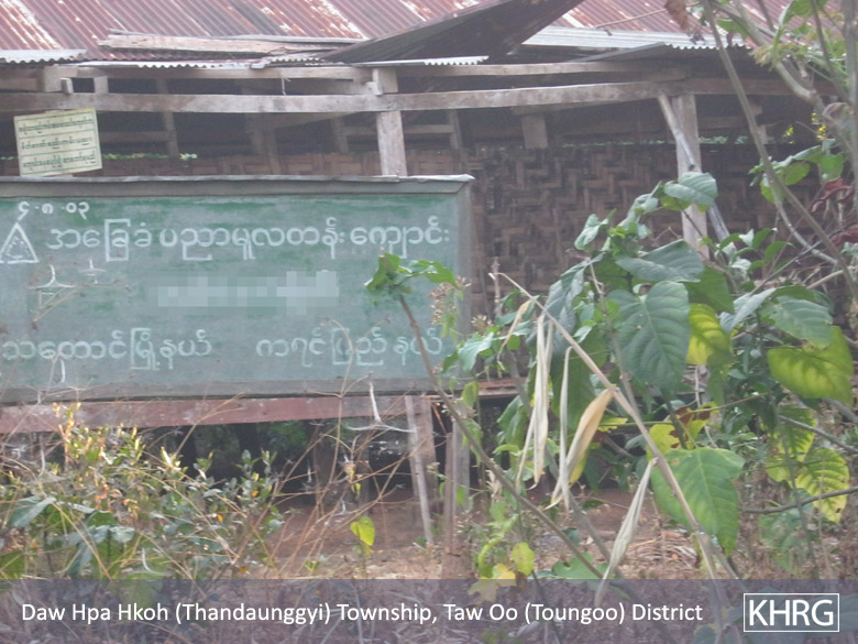 The above photos were taken on February 15th 2012 by a community member in S--- village, A’Htoo Day Tha village tract, Than Daung Township, Toungoo District. These photos show a school in the village that is recognized as a Burma government school, but does not receive sufficient financial support or school materials from the Government. One of the village heads reported that they pay the salary for the teachers every year, but none of the teachers come to their village. Because the teachers did not come to teach in the village, the children cannot go to school. The sign in front of the school is written in Burmese and reads: “Basic Education Primary School, S--- village, Than Daung Township, Karen State.” [Photos: KHRG]