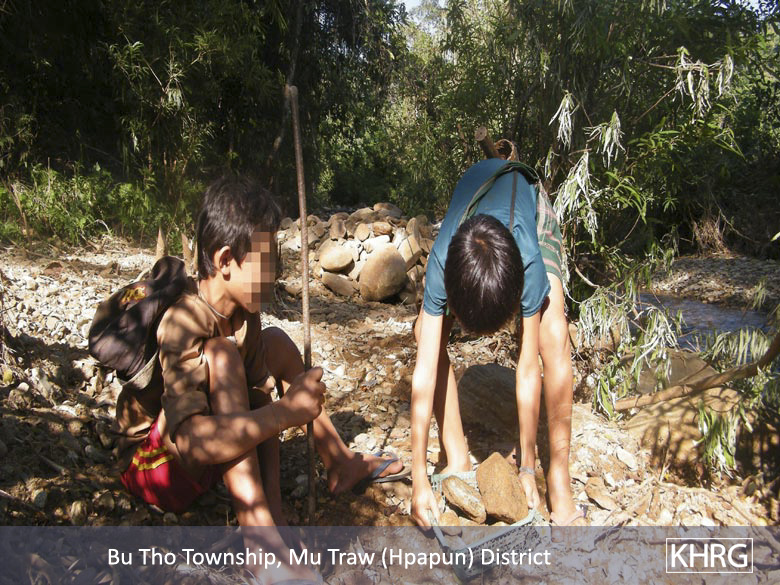 The above photos were taken on January 7th 2013, and show villagers collecting stones in Meh Tee Loh River beside a flat field in order to sell the stones. As they do not have jobs or any steady income, they collet stones for money. These people are not residents of Meh Klaw village tract, but they are from Ta Kon Taing, Way Muh, Way Hsa, Meh T’Roh and T’Poh Klah villages. Some of them are Tatmadaw soldiers’ family members. [Photos: KHRG]