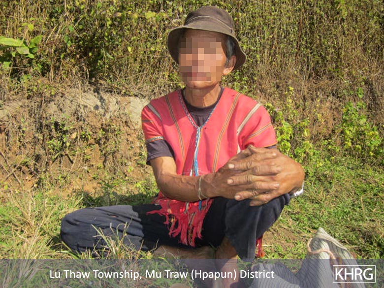 This photo was taken on December 22nd 2013 in E--- place, Hpla Hkoh village tract, Lu Thaw Township, Hpapun District, and it shows Saw C---, 62 years old, who is B---’s village head. He reported on the Tatmadaw’s mortar shelling and military activities in Lu Thaw Township. [Photo: KHRG]
