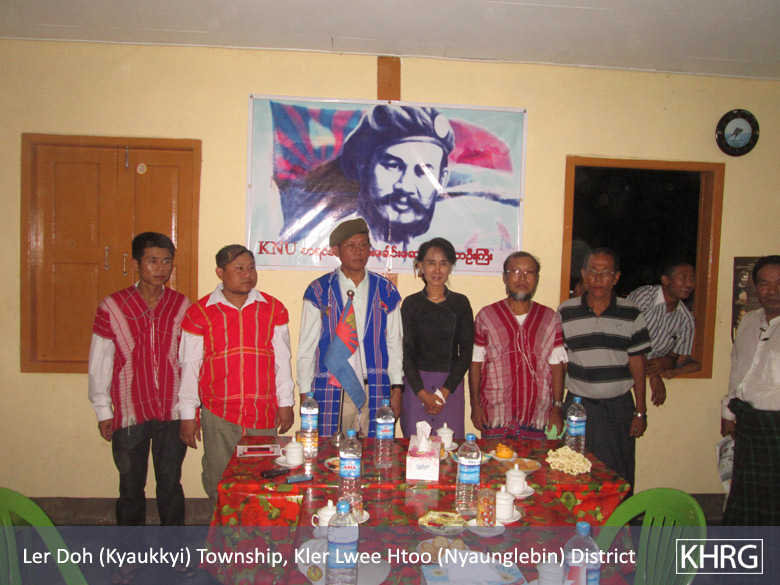 These photos were taken on January 20th 2013 in Kyaukkyi Township, Nyaunglebin District and show a picture of Aung San Suu Kyi and her NLD party members visiting Kyaukkyi town and meeting with Nyaunglebin Karen Nation Union (KNU) leaders, as well as landmine victims and persons with disabilities. [Photos: KHRG]