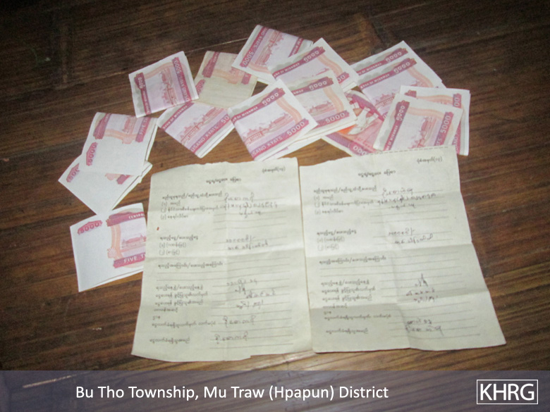 The money lent by the Burmese also has interest. They also lend it to villagers who live on the hillsides. Everyone has to pay back the money with interest after six months. They can borrow again after they have paid it back. They have to pay back the money with interest every six months and they are given a receipt. I took a photo of [one of] the receipts. I also took photos of the money that they were given. The [Karen National Union (KNU)] village tract leader of Meh Klaw village tract wrote a letter after a villager had taken money lent by the Burmese government. I also took photos of the letter written by the leader of the village tract [of Meh Klaw]. In the letter, the village tract leader told the villagers that he had heard that the Burmese had a plan to lend money to villagers, and that the villagers should not [necessarily] take the money. Instead, [they should] meet with responsible people and decide whether they should borrow the money or not.