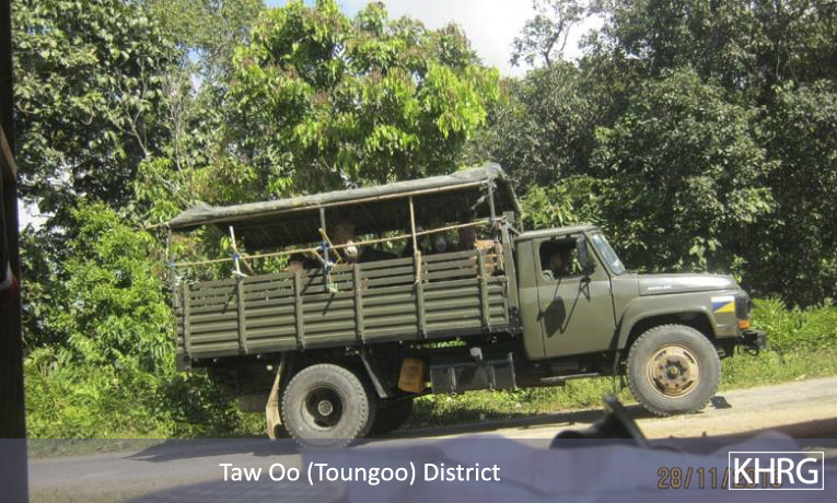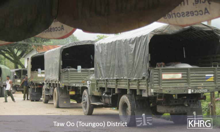 In December 2013, Tatmadaw soldiers in Toungoo District transported a large amount of rations and ammunition using civilian roads. According to the villagers in the area, the Tatmadaw assigned 100 of their soldiers to provide security for the convoy, and they used more than a hundred horses for transporting the supplies. Villagers also reported that when the Tatmadaw are transporting rations and ammunition, despite the fact that the ceasefire is in place and that they are not disturbed by the Karen National Liberation Army (KNLA), they continue to fire mortars in civilian areas to deter KNLA ambushes. As a result, villagers in Toungoo District are worried that fighting will resume again. The Tatmadaw, although they have signed the ceasefire, are transporting rations and ammunition in greater numbers than are needed, according to local civilians.[3]