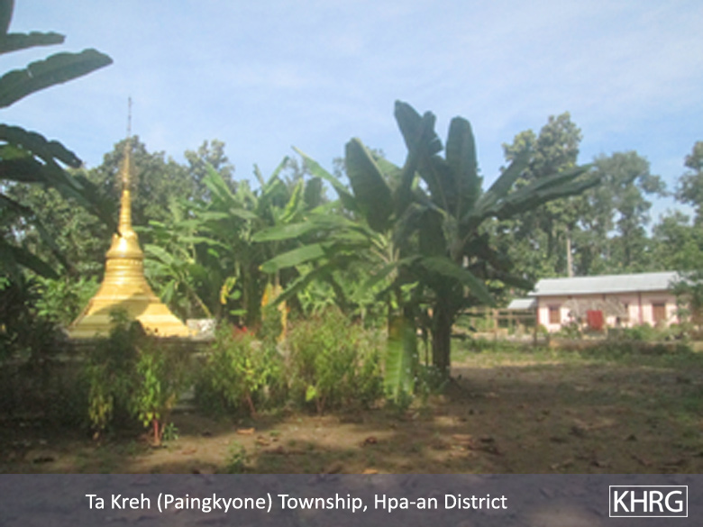 This Interview with U A--- describes events occurring in Paingkyon Township, Hpa-an District in October 2014, including the killing of a monk by soldiers from the Karen National Union/Karen National Liberation Army - Peace Council (KNU/KNLA-PC). On October 9th 2014, in B--- village, a senior monk was arrested by five KNU/KNLA-PC soldiers, including Company Commander Ta Wah. He was arrested, beaten, set on fire and then buried for denying KNU/KLNA-PC soldiers the right to log trees located in the local monastery’s garden. Villagers were able to recover the body and provide the senior monk with a proper ceremony. Villagers subsequently submitted a complaint regarding the incident to KNU/KNLA-PC Company Commander Ta Wah’s superiors. Several months after receiving this report, KHRG learned that on April 20th 2015 four armed groups, the Karen National Union (KNU), KNU/KNLA-PC, the Democratic Karen Benevolent Army (DKBA) and the Border Guard Force (BGF) held a meeting to discuss how to take action against the perpetrators who murdered the monk. It was determined that they will be punished under KNU law. The five perpetrators were detained in Hpa-an District. Following their arrest, Company Commander Ta Wah escaped and his current whereabouts are unknown at the time of publication. For more information see Karen News (Burmese version only).