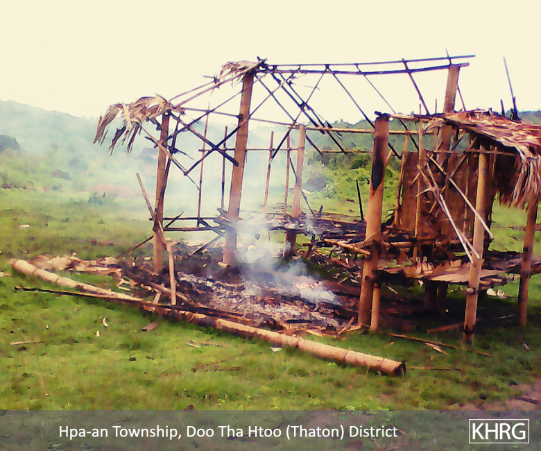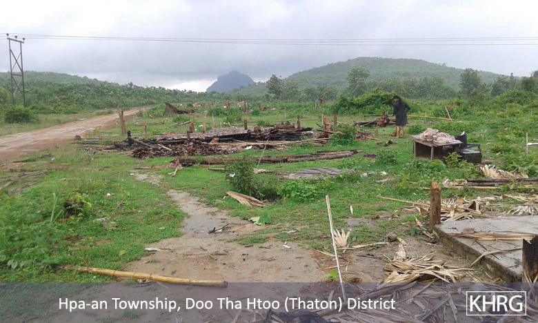 This News Bulletin describes an incident in which the Burma/Myanmar government police force and Burma/Myanmar Department of Forest Management destroyed and burnt down 97 villager houses, displacing approximately 500 villagers in B--- village, Hpa-an Township, Thaton District in June 2015. Despite holding Karen National Union (KNU) issued land grants, villagers were ordered by the Burma/Myanmar government to move out of their village since the government demarcated the area as a forest reserve. However, villagers reported that this land was the location of their old village, which they had to leave behind in 1983 during altercations between the Tatmadaw and the Karen National Liberation Army (KNLA). The villagers also noted that even though the government demarcated the land as a forest reserve, there are no big teak or ironwood trees there. In addition, businessmen from Hpa-an Town came and planted rubber trees and the Tatmadaw sometimes use the area for target practice. The Chief Minister of Kayin State, U Zaw Min, threatened villagers into signing a document stating they agree to dismantle their houses and would not live on that land anymore. In attempting to prevent the destruction of their village, villagers sought help from Saw P---, who attempted to advocate on their behalf, to no avail. When the villagers refused to dismantle their village, the Burma/Myanmar government police arrested 25 villagers, one monk and one KNU/KNLA-Peace Council (KNU/KNLA-PC) member and continued to raid the village, burning and looting villagers’ houses, and planting teak trees. In the aftermath of the raid, approximately 100 villagers fled to Myawaddy with the help of Saw P---, since they do not dare to live in the village any longer. A KHRG researcher also interviewed one of the fleeing villagers and a full interview can be found here.[1]