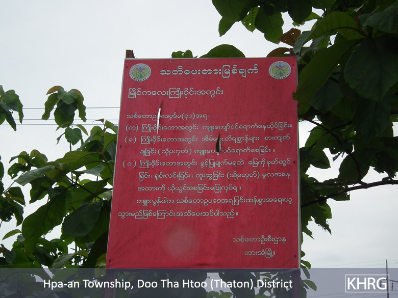 In January 2015, villagers went back to the area and started to build houses and live in the area. On February 1st 2015, U Zaw Min, the chief minister of Kayin State, summoned 15 of these villagers to his office and ordered them to sign an agreement stating that the villagers will dismantle the houses by June 22nd 2015 and will not live on that land anymore. According to the villagers who were summoned by U Zaw Min, “He looked very aggressive and he punched the table repeatedly when he was speaking.” The villagers told a KHRG member that they did not want to sign the agreement, but U Zaw Min threatened to put the villagers in jail, therefore they had no choice but to sign the document.
