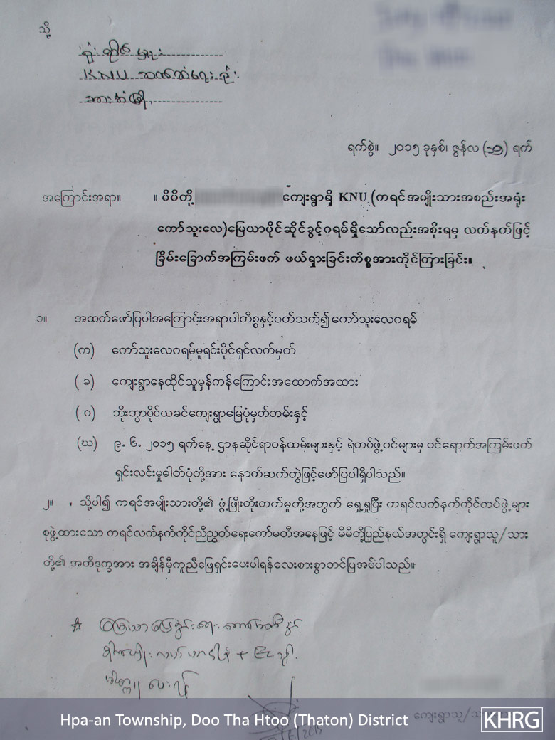 These photos were taken by a KHRG member on July 6th 2015, in B--- village, Kaw Yin A Htet village tract, Hpa-an Township, Thaton District. The photos show a complaint letter that was written by B--- villagers and Saw P--- and submitted to the KNU, Democratic Karen Benevolent Army (DKBA), Mae Tao Clinic and UNCHR-Mae Sot office. The complaint letter is regarding the hardship that the B--- villagers suffered as a result of the Burma/Myanmar government police force and Department of Forest Management destroying their houses, which resulted in their forced relocation. They submitted this complaint letter to the above organisations in hopes that they will help them get their land back and pressure the Burma/Myanmar government to release their fellow villagers that they arrested and continue to detain in Hpa-an and Taung Ka Lay jails. [Photos: KHRG]