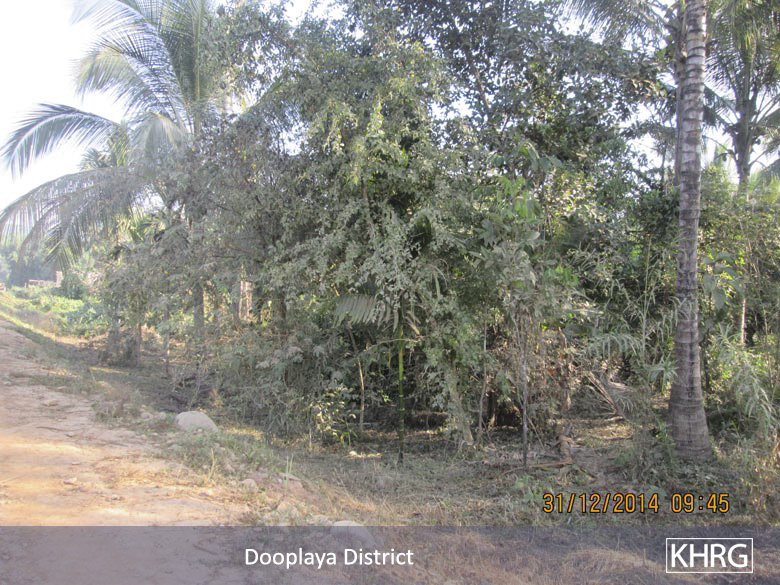 The photos shown above were taken on December 31st 2014. The photo on the left shows 60-year-old Naw A--- who lives in B--- village, Win Yay Township, Dooplaya District and her plantation is shown in the picture on the right. Due to the construction of the Asian Highway,[3] her betel nut, coconut, mango, and jack fruit trees were destroyed. She said that she has not received any compensation for what she has lost. [Photos: KHRG]