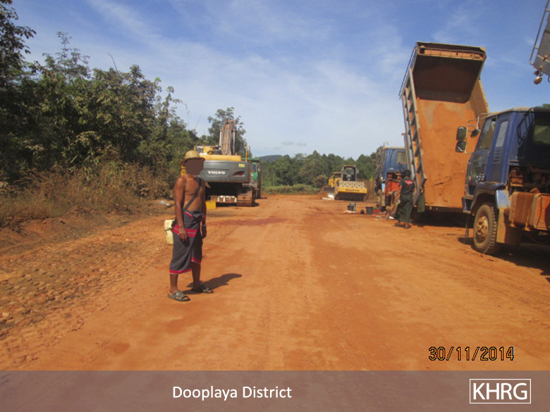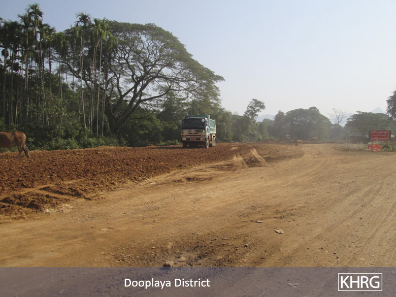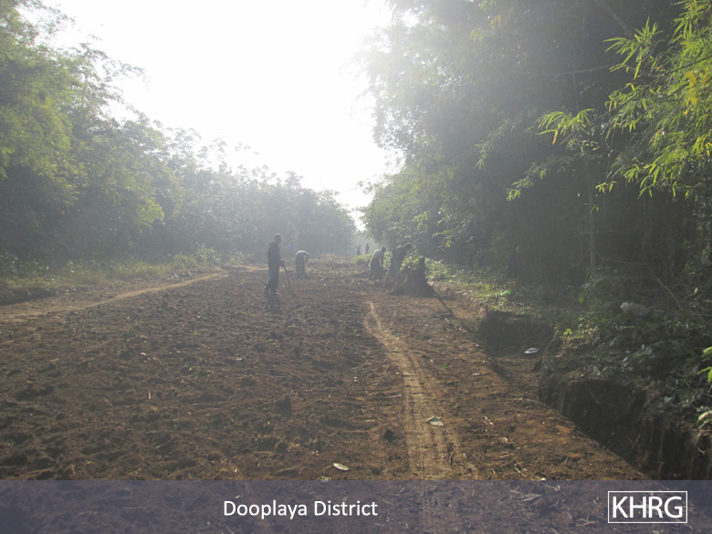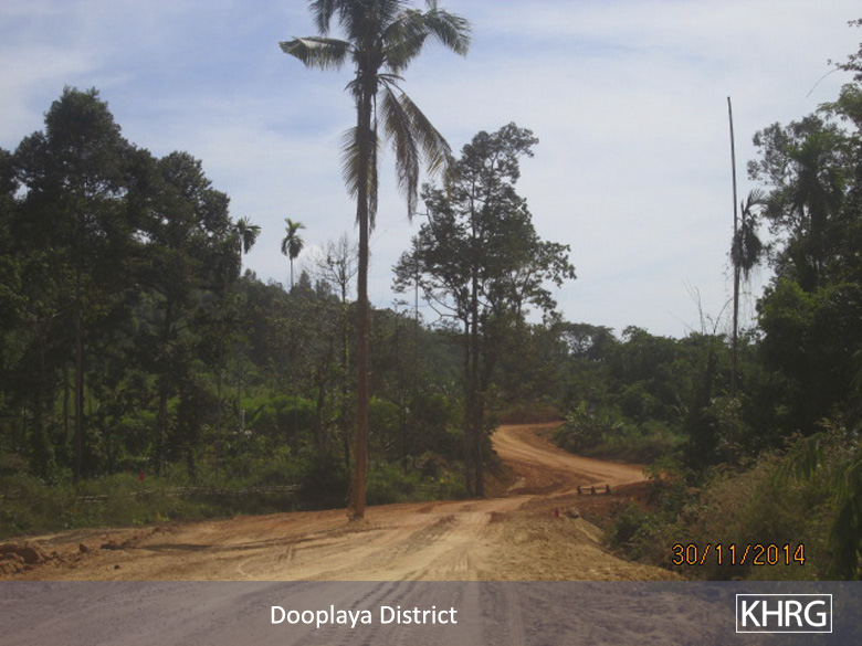 This Photo Set depicts road construction, including the Asian Highway, in Kyainseikgyi and Win Yay townships, Dooplaya District between November 2014 and January 2015. Villager testimony describes land confiscation and the destruction of houses, shops, and plantations in order to make way for the roads. Villagers also report a lack of compensation for the land and crops destroyed as a result of the road construction.