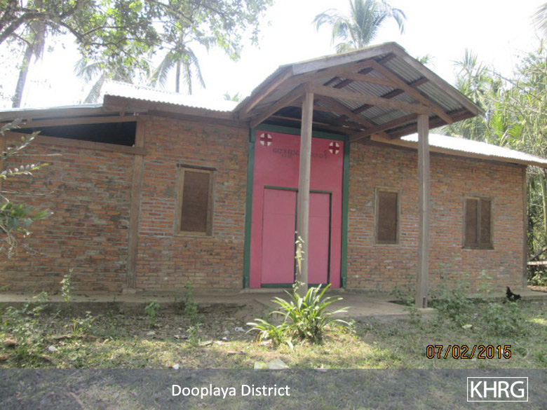 The first two photos were taken on January 23rd 2015 in Win Yay Township, Dooplaya District. These photos show villagers repairing the road which connects H--- village to I--- village by themselves. The third photo was taken on November 30th 2014. The photo is from J--- village, between C--- and D--- villages, in Kyainseikgyi Township, Dooplaya District. The photo shows road construction by the Khin Zaw Company. It destroyed parts of a local sesame and rubber plantation. The plantation owner claimed that there should at least be compensation and if there is none, he will report the issue to the appropriate people. He is yet to receive any compensation. “This is harming [our] human rights,” was stated by the man that is standing in the third photo. The last photo was taken on February 7th 2015 in K--- village in Kyainseikgyi Township, Dooplaya District. In 2014 an unknown Chinese company came and built a clinic for the villagers but no one has utilised it yet. [Photos: KHRG]
