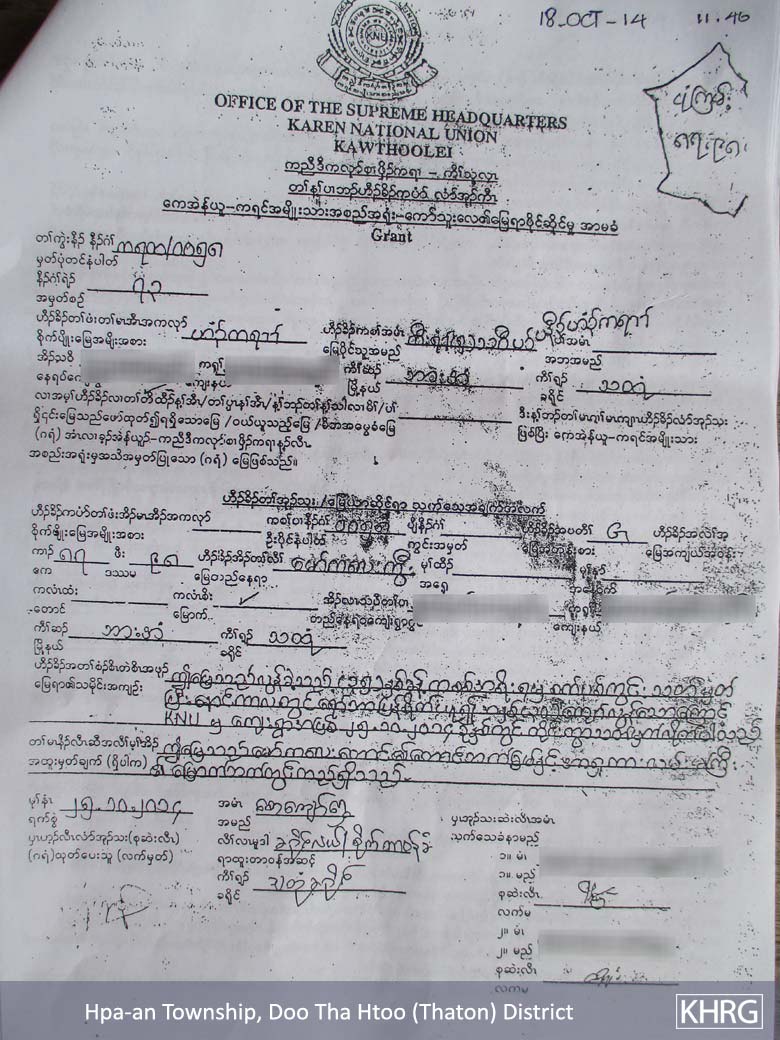 We were very scared because there were a lot of police [officers] in front of us. If he gave the order, we could have been put in jail. Then he said, “We are not finished yet.” He asked us to provide our signatures. We were sent back to the Department of Forest Management office and we provided our signatures. It was about 4:00 pm. When I went back home after I had provided my signature, I immediately [started to] demolish my house. I do not care if I do not have the land. I am not going to live on the land. I had demolished the roof of my house. My brother Saw F--- told me, “Don’t do this! You have built your house. It is not as if you do not have any document. You have the document, land grants produced by KNU. You can live here.” Then I decided to continue living on the land. While we lived there, people always came and threatened us whenever they came to us.
