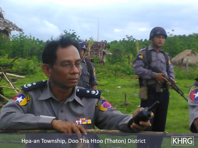 They [police] told me that I am very talkative and whenever I was asked something, I could respond to everything. I told them, “You said that this land is the forest [reserve] land but there are no trees. Where are the trees? Show me. There is only grass and small plants.” As I see there are no big trees, I told them that it is not a forest reserve. I argued with them like that. Ye Min Aung [Hpa-an Township administrator] and Thein Aung [Hpa-an Township Forest administrator] came and argued with me about that three or four times. One time, they came to me at midnight, 12:00 o’clock, when I was sleeping. About 35 police and the village head came into our village and said that we cannot live here and we had to demolish our houses.