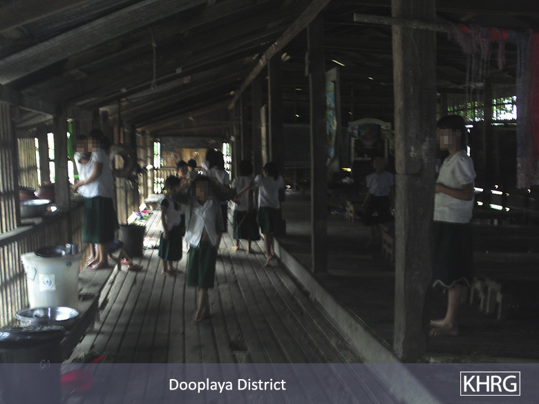 These photos were taken by a KHRG community member on July 20th 2015, in J--- village, Kawkareik Township, Dooplaya District. The photos shows the J--- village primary school and students after the school reopened when fighting between the DKBA and Tatmadaw soldiers ceased. The school was closed for two days, on July 15th and July 16th 2015, because of the fighting. According to J--- villagers, DKBA soldiers slept in the school one night during the fighting and on another night Tatmadaw soldiers from Light Infantry Battalion (LIB) #230 led by Battalion Commander Aung Naing Thu slept in this school. [Photos: KHRG]