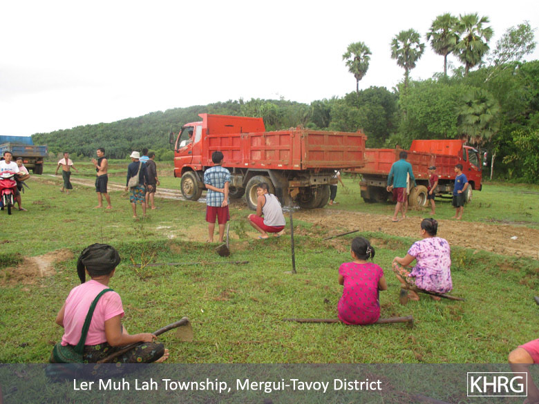 The above photos were taken on May 18th 2015 in Thu Pyaw village, Ma Saw village tract, Ler Mu Lah Township, Mergui-Tavoy District. These photos show the villagers participating in road construction, led by the Asian World Company. [Photos: KHRG]