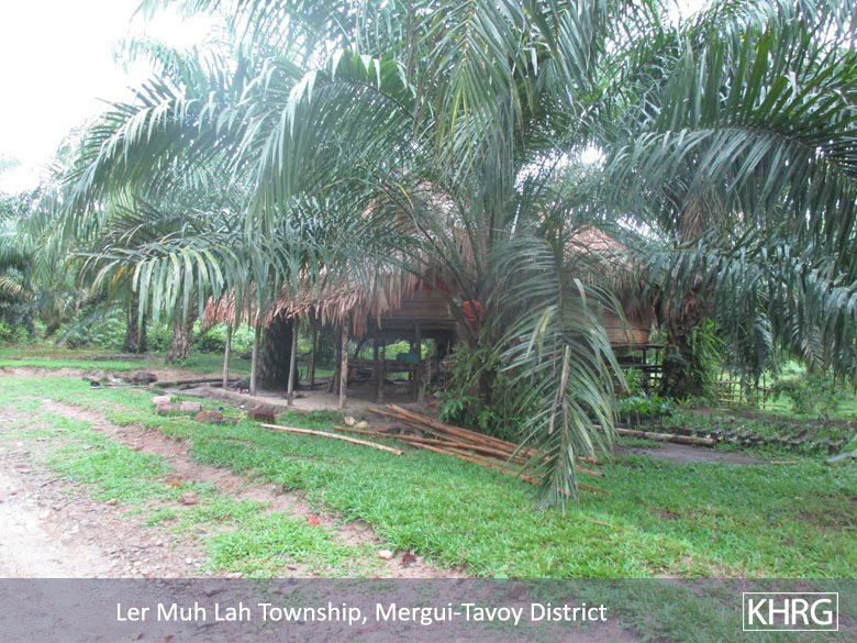 These photos were taken on May 18th 2015 in Nge Yan Eaing village, Ma Saw village tract, Ler Mu Lah Township, Mergui-Tavoy District. These photos show the houses that the villagers constructed under palm oil trees planted by the Asian World Company in 2015. This land belonged to villagers and was confiscated in 1997. The Asian World Company has not paid any compensation to the villagers. [Photos: KHRG]