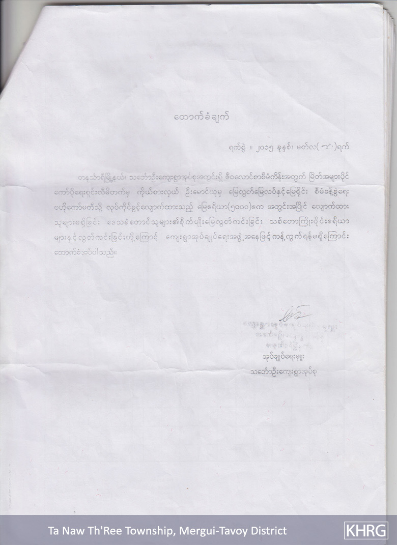 The following Situation Update was received by KHRG in June 2015. It was written by a community member in Mergui-Tavoy District who has been trained by KHRG to monitor local human rights conditions. It is presented below translated exactly as originally written, save for minor edits for clarity and security.[1] This report was received along with 61 photographs from Mergui-Tavoy District.[2]