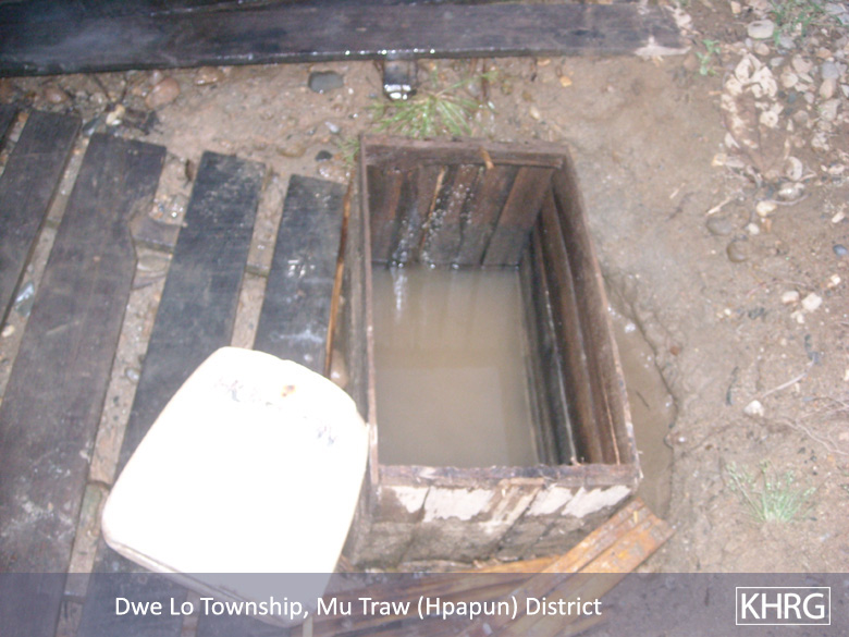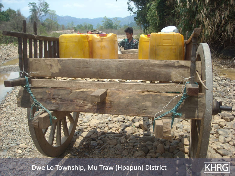 These photos were taken by a KHRG community member on May 8th 2013 in Waw Muh village tract, Dwe Lo Township, Hpapun District. The first two photos show the small wells which villagers in Waw Muh village tract dug to obtain some clean water for drinking and cooking. The last two photos show villagers carrying water from far away to their village using a cart. According to a community member, prior to the establishment of gold mining operations in the area, villagers used to collect their cooking and drinking water from Bu Loh River. In 2010, unidentified private companies, in collusion with local Tatmadaw and KLNA officers, came and mined in Bu Loh river and nearby lands. As a result, the water in Bu Loh River became polluted and villagers do not dare to use it for cooking, bathing or drinking anymore; therefore, they have to transport all their water from far away to their village using carts. [Photos: KHRG]
