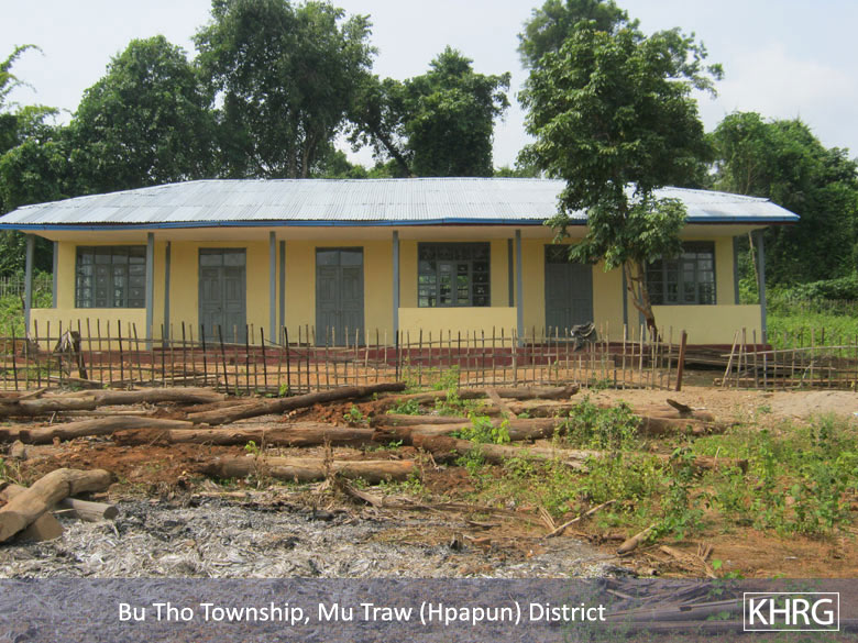 These two photos were taken by a KHRG community member on October 14th 2013 in N--- village, Bu Tho Township, Hpapun District. The photos show a primary school that was built by the Burma/Myanmar government for N--- village in 2013. N--- villagers reported to KHRG that this new school was supposed to be built with teak and brick, but the Shin Than Thit Sa and Lucky Development companies, which were subcontracted by the Burma/Myanmar government to construct it, built it by mixing various woods that are not strong enough for a school building. Villagers complained that these companies did not accept the villagers’ feedback when they told them how they wanted their school to be built. Although the exterior of the school has been built, the courtyard and fence have been left unfinished, as can be seen in the photos. The building is also not strong enough to last very long, according to villagers. They are worried because the companies who built the school were motivated by profit, and not their good-will. The government officials who were responsible for the school building project did not oversee the construction process, and they accepted the sub-par final product because they had embezzled some of the funds that were ear-marked for the project. [Photos: KHRG]