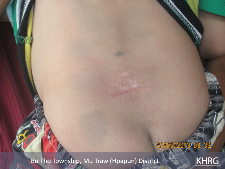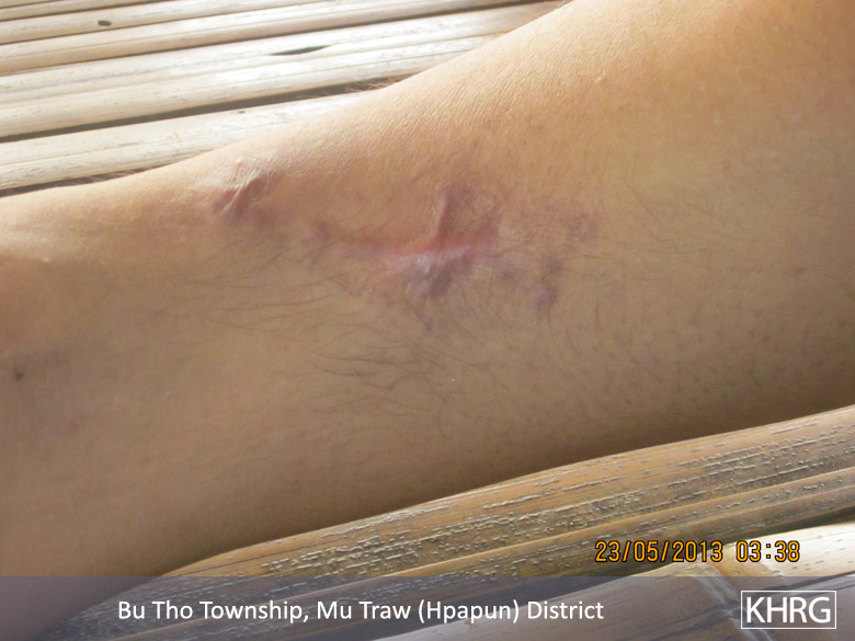 The above photos were taken on May 2013 in A--- village, Htee Th’Daw Hta village tract, Bu Tho Township, Hpapun District. The first photo shows the scar of A--- villager Ma C---, who was struck on her calf by a grenade which did not detonate, and the second photo shows scars on her son, who was also injured when the failed grenade grazed his back on January 15th 2013. According to a KHRG community member, BGF Battalion #1014 Warrant Officer Saw Day Day came to A--- village while drunk and demanded gasoline from Ma C---. When she told him she did not have any, he threatened to shoot her with his grenade launcher, which then accidentally discharged in her direction. [Photos: KHRG]