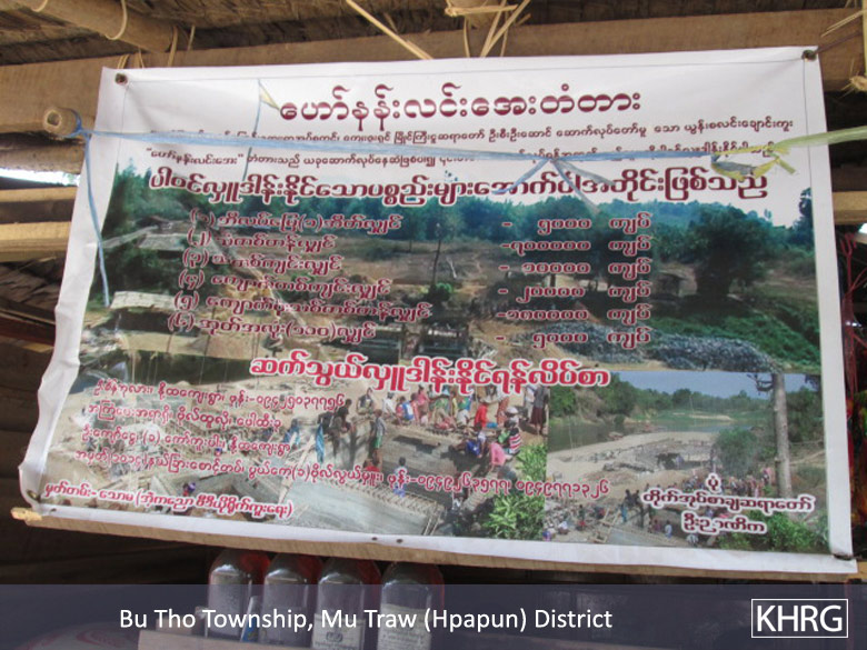 In Bu Tho Township, Hpapun District, villagers reported that they were ordered to do labour for a bridge construction. The bridge, named Haw Nan Lin Aye bridge, which the local people refer to as Htee Lah Beh Hta bridge, is located in Noh Hta village, Pu Zun Myaung village tract, Bu Tho Township, Hpapun District at the northern part of the mouth of Yunzalin River.[20]
