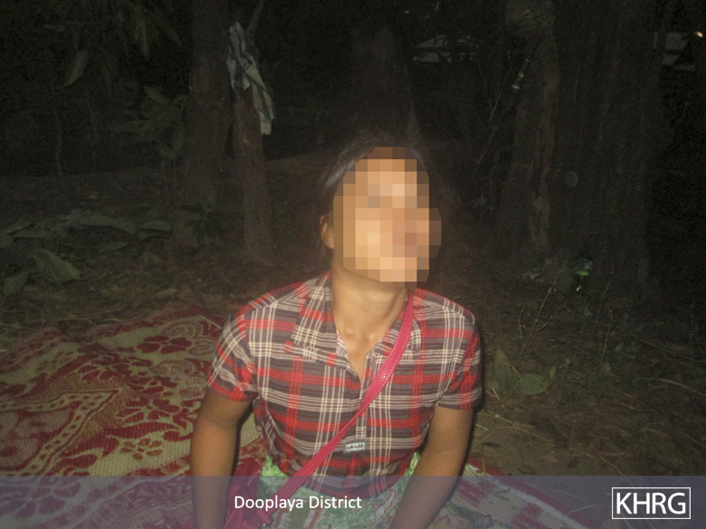 These photos were taken on February 12th 2015, in O--- village, Paingkyon Township, Hpa-an District. The first two photos are of Naw C--- and Naw D---, the daughters of Naw B---, who were arrested by the BGF for selling yaba on February 12th 2015. The BGF confiscated 20,000 pills of yaba, a 32mm pistol and as well the money they earned by selling drugs. The BGF also intended to arrest Naw B---, but were unable to do so, as she fled and sought cover with the KNU/KNLA-PC Operations Command #3. The Battalion Commander Kyaw Kyaw warmly welcomed Naw B---, and a KHRG community member expressed that Commander Kyaw Kyaw should teach her not to sell drugs again. [Photos: KHRG]