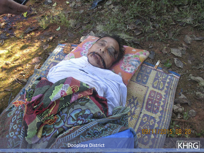 This photo was taken on September 11th 2015. The deceased person in this photo, Kyaw Bleh, who was a Mi Gan Kyar Ma Nai villager, was over 50 years old when he died in a motorcycle accident. On September 10th 2015, in Kawkareik Township, Dooplaya District, at 3:00 PM, while he was heading to Kawkareik Town, he was hit by another motorcycle and died immediately in Kaw Hser village. The person who crashed into Kyaw Bleh, Saw A---, had to be hospitalised. Saw A---, from Law Par village, was under the influence of yaba when he caused this accident. He was ordered to provide compensation to Kyaw Bleh’s family. [Photo: KHRG]
