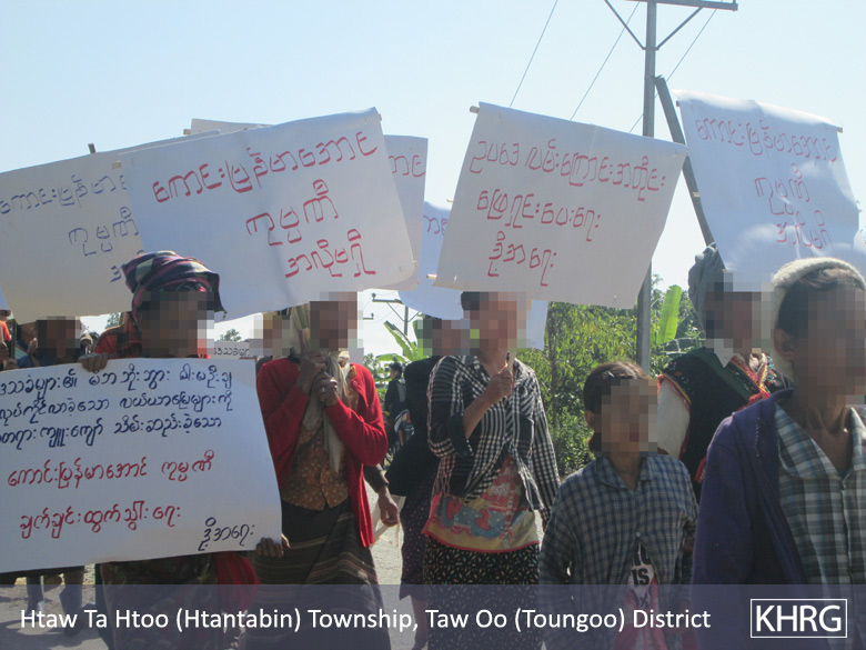 The above photos were taken on January 12th 2016 in Toungoo Town, Thandaunggyi Township, Toungoo District, show villagers from two village tracts gathering together on the road in Toungoo Town to hold a land demonstration. It was the second time they held a protest against Kaung Myanmar Aung Company to get their land back. [Photos: KHRG]