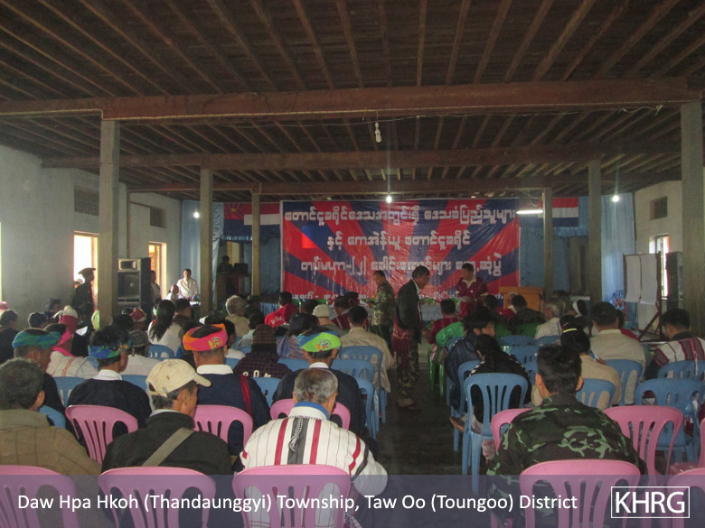 The above photos were taken on December 29th 2015 in Leik Tho Town, Thandaunggyi Township, Toungoo District. The photo on the left shows the KNU leaders holding a meeting with civilians and educating them about the NCA. The photo on the right shows Tatmadaw officers from Battalion #603 who also participated in the meeting. [Photos: KHRG]