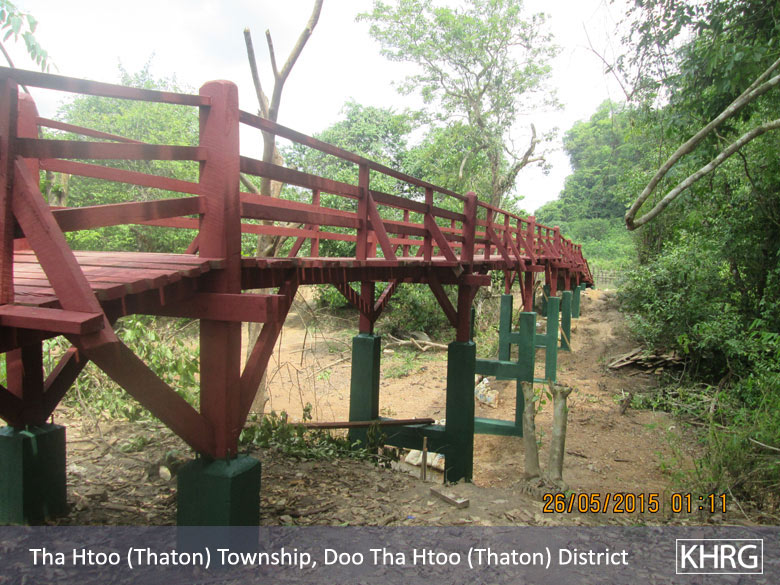 The photo above on the left was taken on March 16th 2015 in the lower part of Naw K’Toh village, T’Rweh Kee village tract, Thaton Township, Thaton District. It shows the clinic that was built by the United Nations High Commissioner for Refugees (UNHCR). They had also distributed mosquito nets to villagers, reaching almost every family. The photo on the right was taken on May 26th 2015 in the upper part of Naw Ka Bo village, Ta Ma Daw village tract. It shows the bridge which the American Refugee Committee (ARC) constructed to enable the students in the area to go to school in other villages with greater ease. [Photos: KHRG]