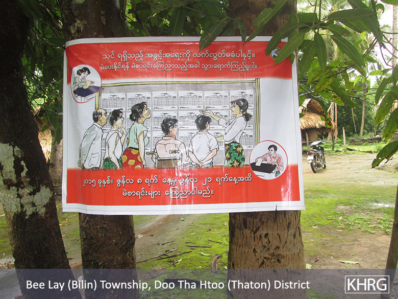 - Regarding the 2015 general election, local villagers across Thaton District complained of disappointment about representative parties for not holding proper education in their constituency during the campaign period. Villagers did not understand how to vote and where to vote. In addition, local people who did not have an ID card were not allow to vote but also some people who were eligible to vote were excluded from the voting list.