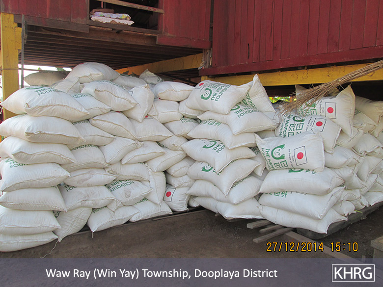 As the political situation changes more opportunities have opened for NGOs and INGOs to access the local community and launch distribution for the purpose of community development. KHRG community members reported that the Nippon Foundation,[18] a Japanese NGO, entered Dooplaya District and distributed basic household products such as rice and solar panels. However, when the KHRG community member reached Kawkareik Town in Dooplaya District on January 29th 2015 to report on the regional situation, the support had not accurately been distributed to the local people. A villager reported that as part of the aid of rice, one person received a bag of rice, but in Kyauk Ki Village in Kawkareik Town a villager said that two bags of rice arrived to one house. In villages in Win Yin Township, only one bag of rice arrived to one house. Moreover, some villages that do not have household registration were not distributed a complete bag of rice, and some villages did not receive the rice distribution at all. In the villages in the west of the mountain, in Win Yin Township, solar panels [all around one cubit] and light bulbs were distributed by the Japanese organisation, to 96 villages in total.[19]