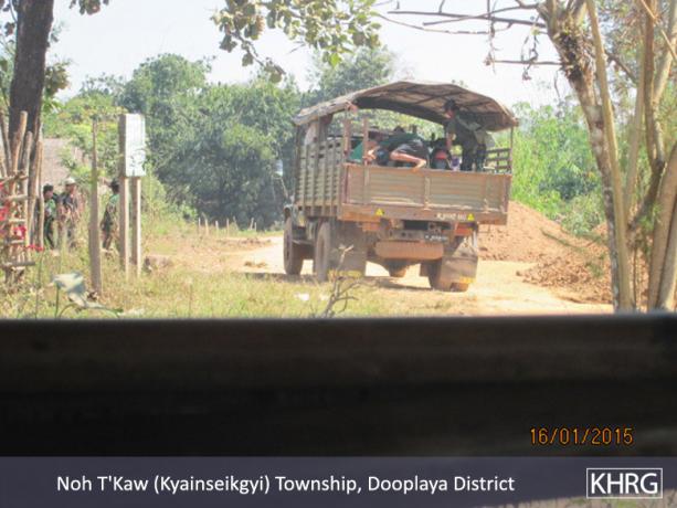 Based on the received information, KHRG found that although the peace process was conducted between Burma/Myanmar military government and ethnic armed groups, the military situation in each Township in Dooplaya District remained as it was in the past, before the ceasefire. For example, there was a military target practice launched by the Tatmadaw Light Infantry Battalion (LIB) #310 on January 19th and 20th 2015 in Kone Myint Thar Yar village, Kone Myint Thar Yar village tract, Win Yin Township. And in Kyainseikyi Township an unknown Tatmadaw battalion transported rations and ammunition to their front line camps on January 16th 2015. In Kawkareik Township the fighting between Tatmadaw and DKBA broke out on the Asian Highway between Kawkareik and Myawaddy Town.
