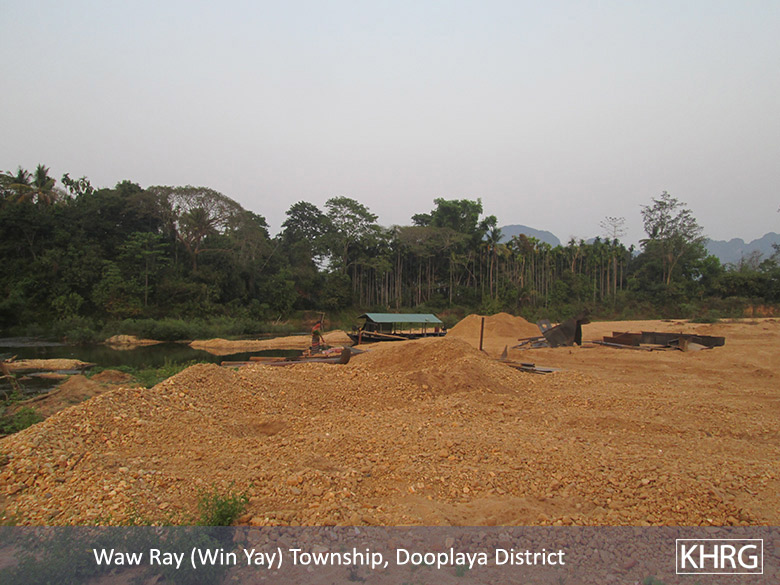 Moreover, some village heads and some village tract leaders cooperated with the ethnic armed group [KNLA] and they intimidated the villagers in complex ways. It is because, for example, one checkpoint officer from the KNLA and a businessman [Kyaw Thel Htoo] from a town worked together to remove sand and stones from the ground in A’Nan Kwein village. The villagers did not dare to talk about anything regarding the removal of stones and sands. However, the villagers had to buy sands and stones from their area, which had been removed by the businessman and the KLNA checkpoint officer, when they [villagers] needed it. Now the environment has been damaged by the removal of very large amounts of sand and stone.