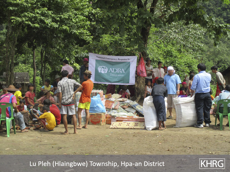 These photos were taken by a community member on October 10th 2016 at D--- village, Meh Proo village tract, Hlaingbwe Township, Hpa-an District. The first row of two photos show villagers who had fled from the fighting collecting donations provided by two border-based CBOs, Adventist Development and Relief Agency (ADRA) and Partner. The CBOs donated mats, clothes, longyis, machetes, toilet bowls, stoves and food to the newly displaced people. The bottom two photos show temporary hunts and shelters that are built for villagers who had displaced from the fighting from the Meh Th’Waw area. [Photos: KHRG]