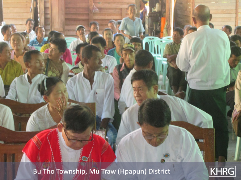 The above photos taken on April 17th 2015 show the Union Solidarity and Development Party [USDP] holding a ‘Farmers Public Affairs Meeting/Forum’ in Mu Traw [Hpapun Town] assembly hall. They asked the farmers to enter the meeting for listening [to the discussion]. They asked all land owners whose lands were confiscated by Tatmadaw to attend the meeting. They asked villagers from Ss---, Tt---, Uu---, Vv---, ML---, and other villagers to attend the meeting in Mu Traw assembly hall. Before they [villagers] entered the meeting they [USDP] collected [registered] the name of each villager then they distributed small calendars to each of them. They [USDP] said that is the first time for them to hold a ‘Farmers’ Public Affairs Meeting’. During the meeting they explained that farmers are not only the people who work in the farms, it also includes the people who raise [farm] fish, cultivate the land and the people who work on plantations: they are all called farmers. Hpapun area is looked after by [USDP member] U Soin Than Naing and he develops the livelihood [systems] and [upgrades] the road [because] he is a public representative. Even though they held the meeting to meet with villagers they did not ask the villagers the express their opinions. They [USDP] talked among themselves and answered the question amongst themselves. They said they were not going to return the lands or give the compensation for the lands which have been confiscated by Tatmadaw. [Photos: KHRG]