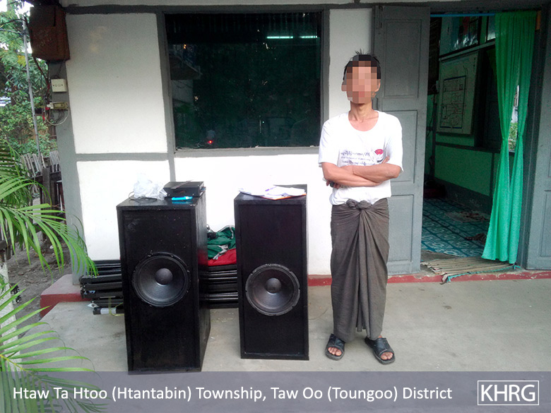 From U Myint Soe, who is a labour agent, and he is currently included in the list of people who were sued. He also borrowed the loudspeaker from somebody else, and the person he borrowed the loudspeaker from was a GTC [Government of Technological College] student. When he contacted that person he was not reach able them and the loudspeaker could not be returned. So the Chief of Police asked for that person’s phone number, but he [Chief of Police] was only focused on me. I just have to present it [loudspeaker] as a sample of evidence, so I need to buy a fully equipped loudspeaker. I have bought a sound box, which cost me around 100,000 kyat [$73.79][6], and for the loudspeaker, even if you buy an old one, the price is from 150,000 kyat [$110.69] up to over 200,000 kyat [$147.59], but now I have financial difficulty buying the fully equipped loudspeaker.
