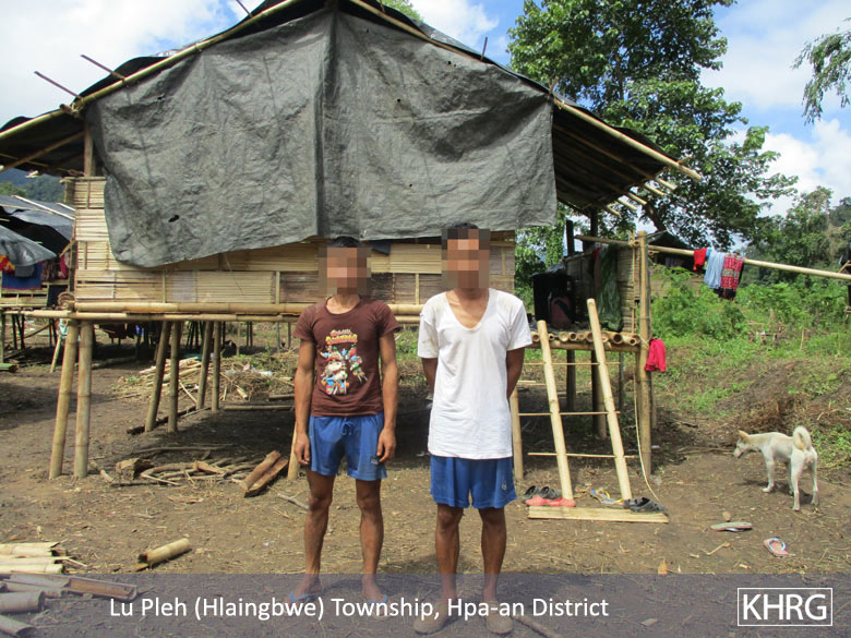 This picture was taken on October 7th 2016 in D--- village, Hlaingbwe Township, Hpa-an District. The picture shows two villagers from other villages who have been selected as the temporary village heads in D--- village, whilst internally displaced persons (IDPs) stay there. They described about villagers from their villages who faced human rights abuses which were committed by the Democratic Karen Buddhist Army led by Bo Bee. [Photo: KHRG]