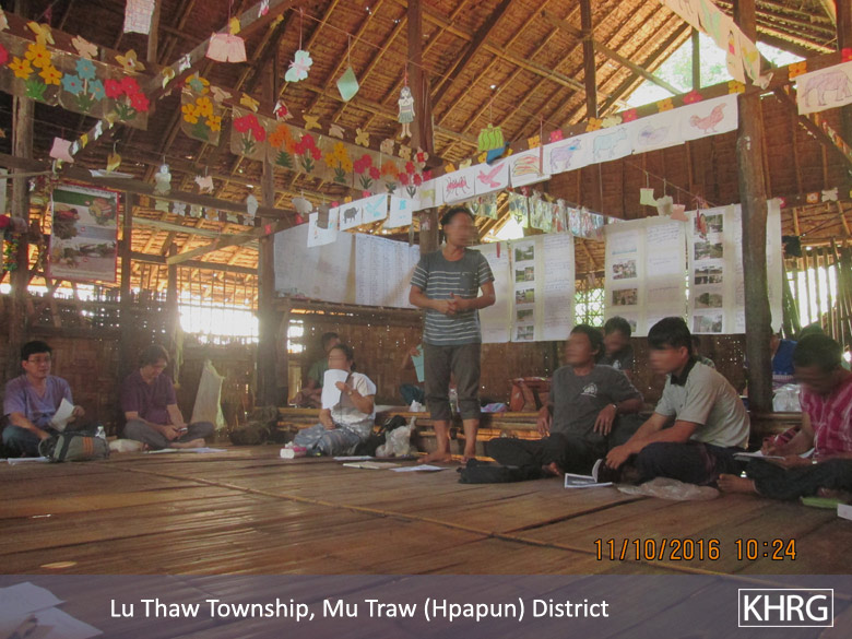 This photo was taken on October 11th 2016 during a discussion held by Karen community based organisations and local IDP leaders about the resettlement and return process in Ei Tu Hta IDP camp hall. [Photo: KHRG]