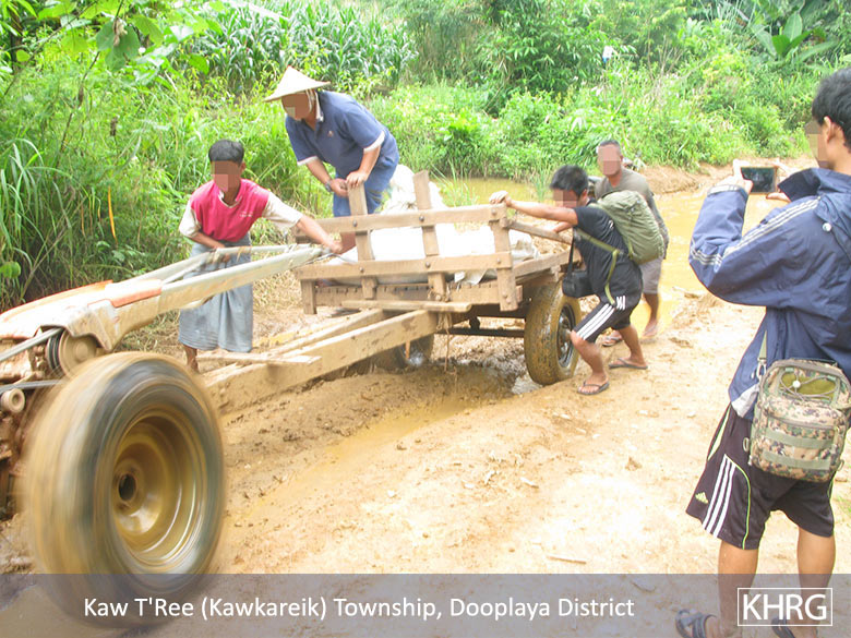 This photo was taken nearby B--- village, Kawkareik Township, Taw Naw Mu Htaw area and shows villagers using a road. However, starting from May to October 2016, some villagers reported it was difficult for them to travel by car, motorbike and tractor in this place because Tatmadaw army bases were located nearby. If Tatmadaw wanted to call villagers for help, villagers had to transport Tatmadaw supplies and Tatmadaw soldiers, which created problems for villagers to travel. [Photo: KHRG]