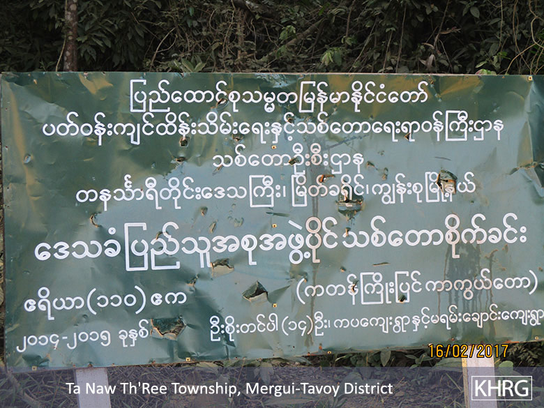 The above photo was taken on February 17th 2017 in Ta Naw Th’Ree Township, Mergui-Tavoy District, and shows a sign board describing the reserved forest where Saw A--- says the Burma/Myanmar government confiscated B--- villagers’ land. According to the sign board, the project title is: ‘Ka Tan Kyon Pwin Community Reserved Forest’; the project is led by the Forestry Department of the Burma/Myanmar government; the area included in the project is 110 acres; the project period is from 2014 to 2015; 15 villagers from B--- and D--- village participated in this project. [Photo: KHRG]