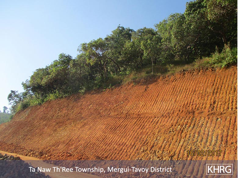 These photos were taken on February 17th 2017 in B--- village, Ta Naw Th’Ree Township , Mergui-Tavoy District. These photos show road constructors constructing the road on Saw A---’s land. Saw A---’s cashew and rubber plantations were damaged after the road constructors dumped soil and rocks onto his trees. [Photo: KHRG]